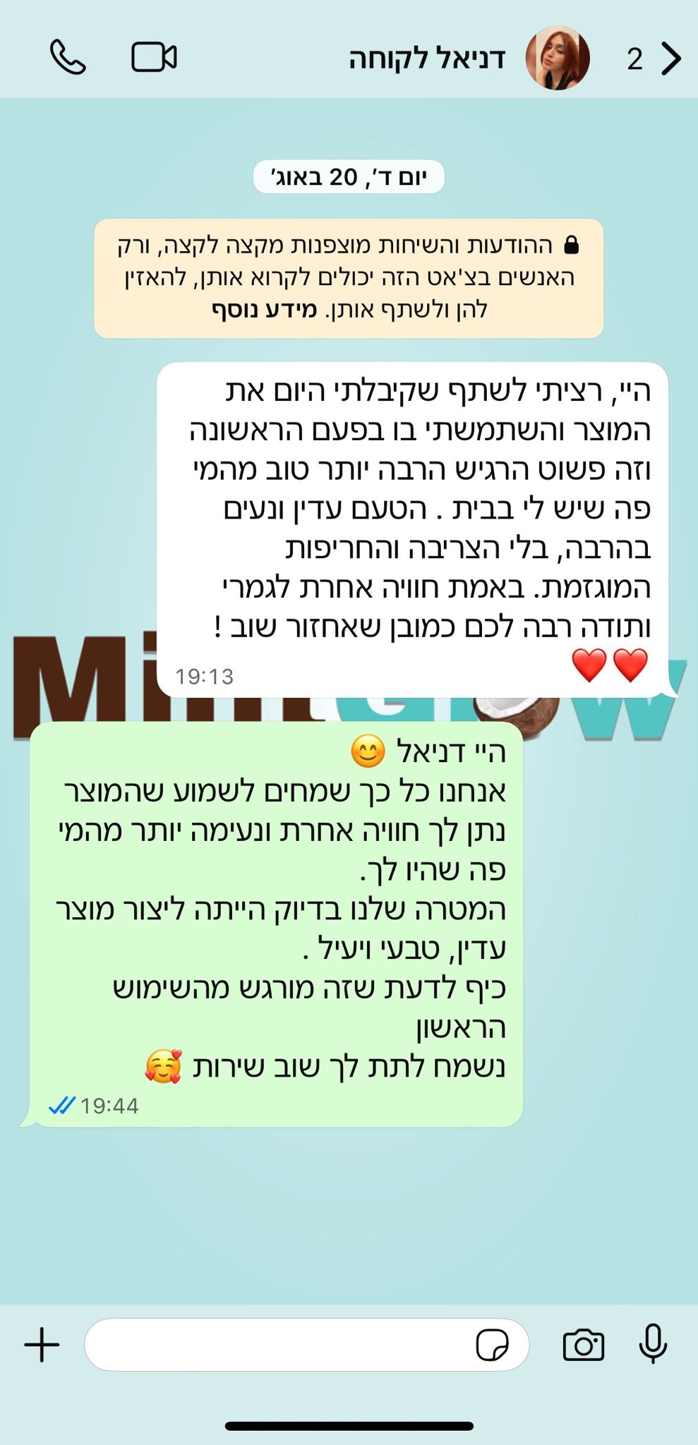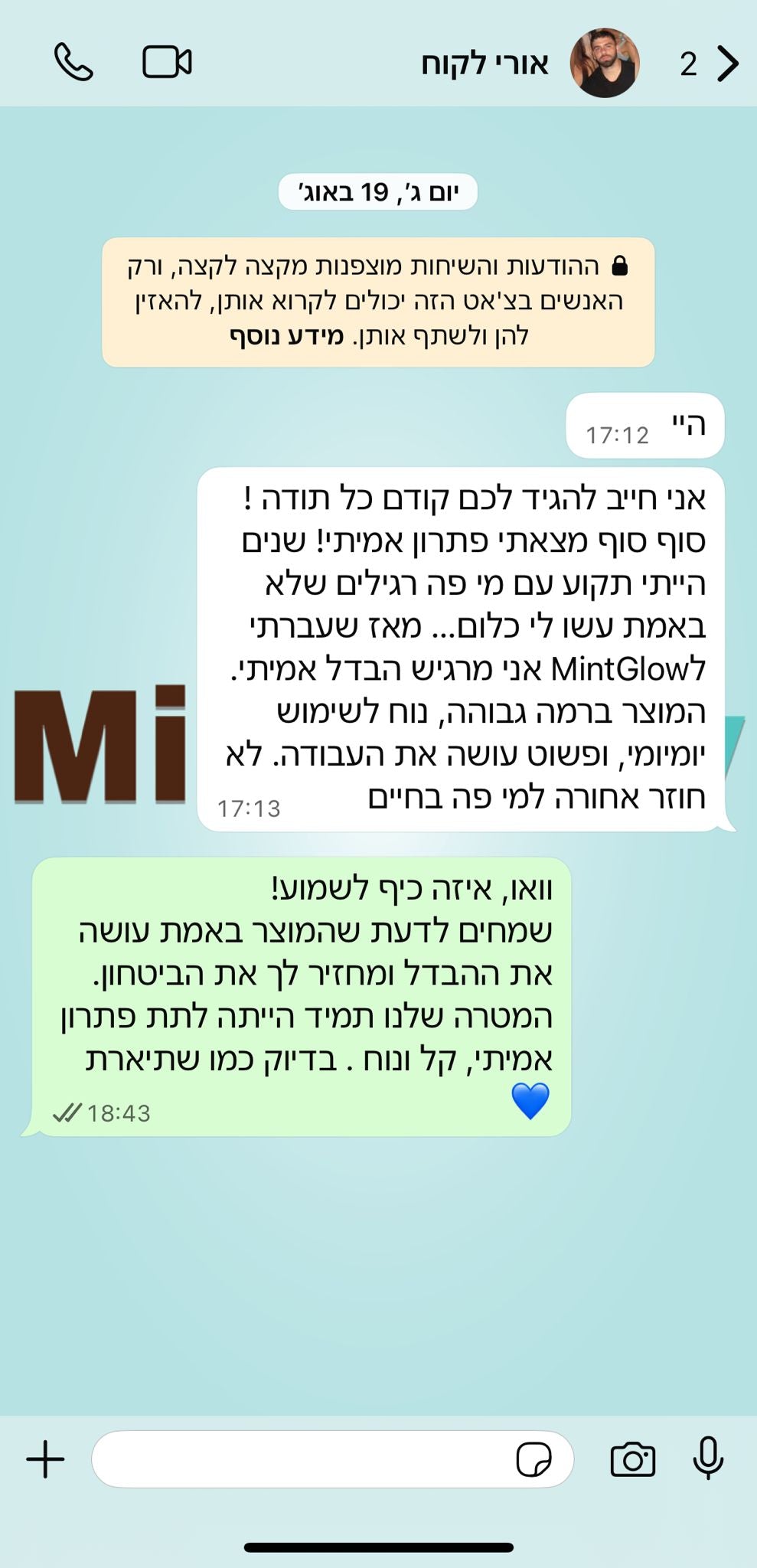 "ืื ืืืืื ืืฉืชืืฉืชื ืืื ืคื , ืืชืืื ื ืฉืืจ ืื ืืขื ืืืืื ืืืง ืืจืื ืื ื ืขืื ืืืจื ืืื ืฉืขืืช. ืืื ืฉืขืืจืชื ื-MintGlow ืืื ืืฉืชื ื! ืืื ืืขื ืืืืื, ืืชืืืฉื ืืคื ื ืงืืื, ืืฉืื ืืื ืฉืื ื ืจืืืช ืืื ืืช ืืืชืจ ืืืจืื ื ืฉืืจ ืจืขื ื ืืื ืืืื. ืื ืืืืจืช ืืืืจื ืืฉืื ืืฆื!"